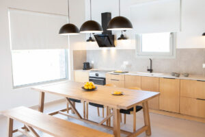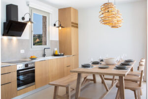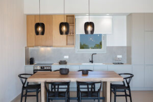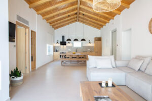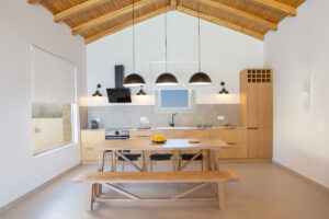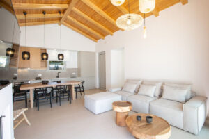 בקומת הכניסה, חלל מגורים פתוח ומואר ויפהפה עם מטבח מודרני מאובזר במלואו ושולחן אוכל גדול מהמנזר, אזור ישיבה נוח עם דלתות הזזה מהתקרה עד הרצפה,, ומעבר לאזור בריכת הפטיו במרפסת המשלב בהרמוניה את החיים הפנימיים והחיצוניים.