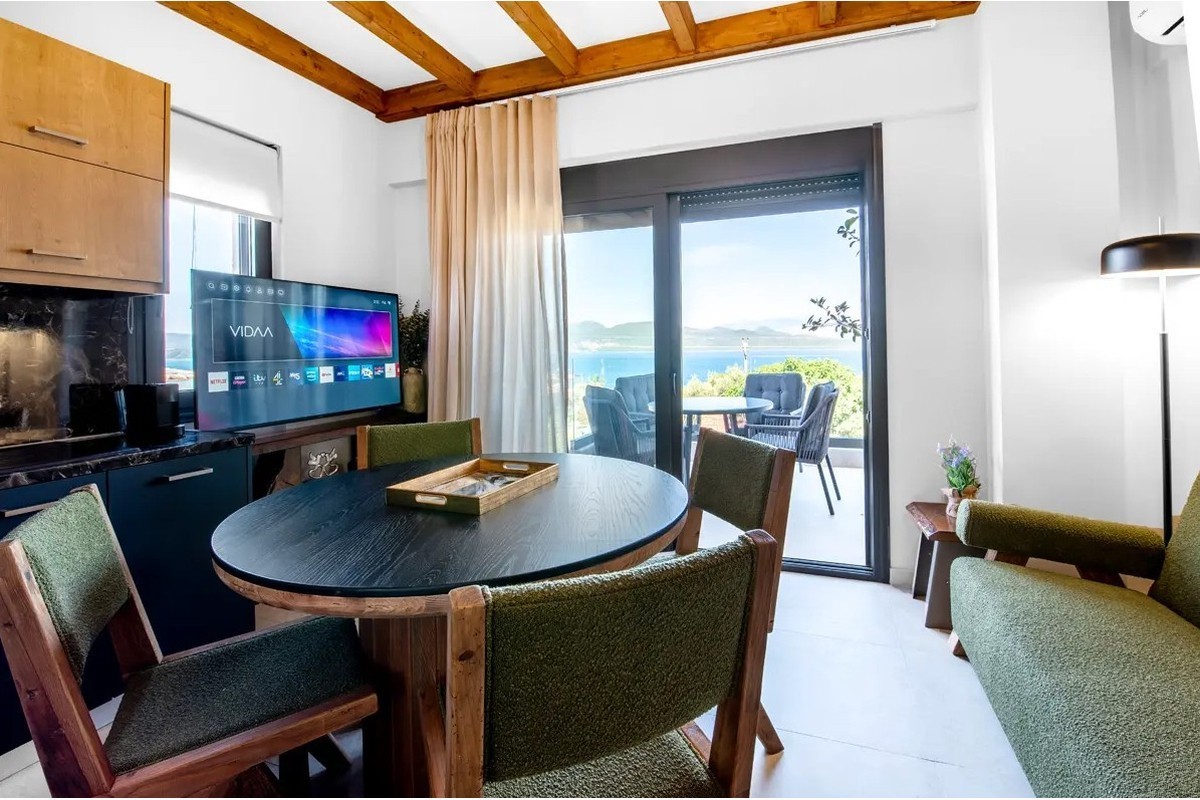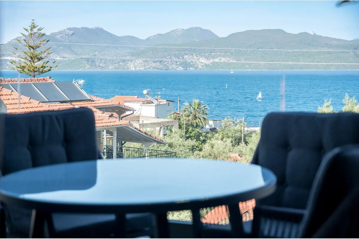 מרפסת פרטית עם שולחן אוכל ונוף מרהיב אל הים