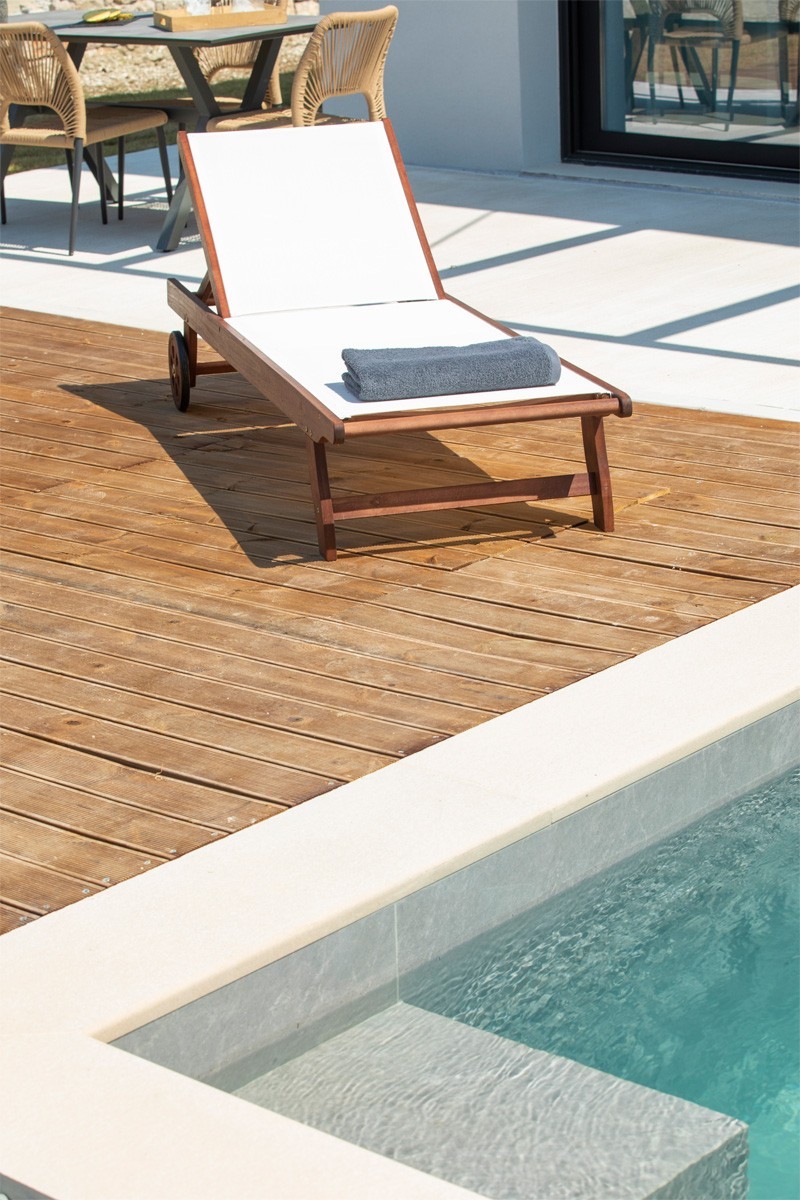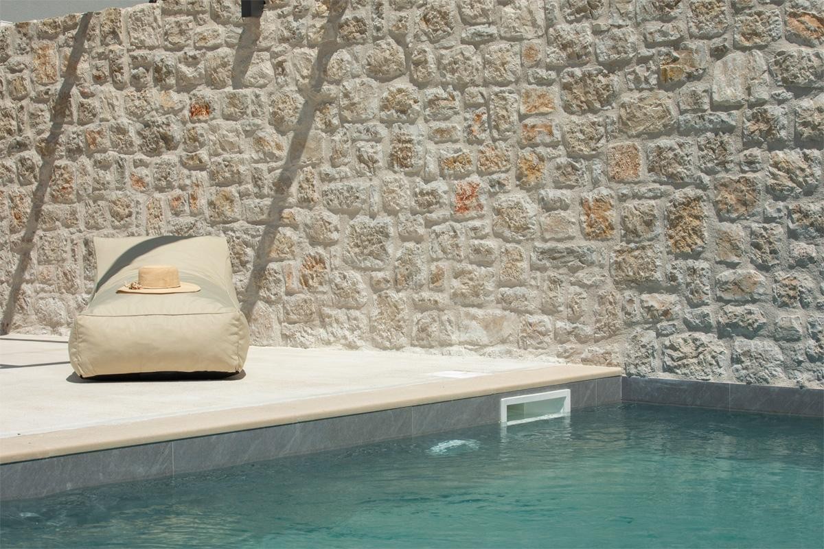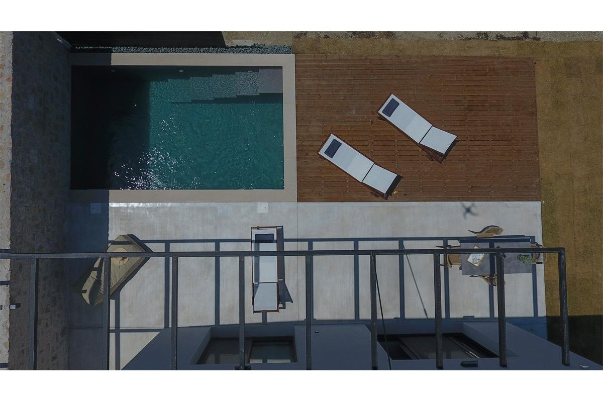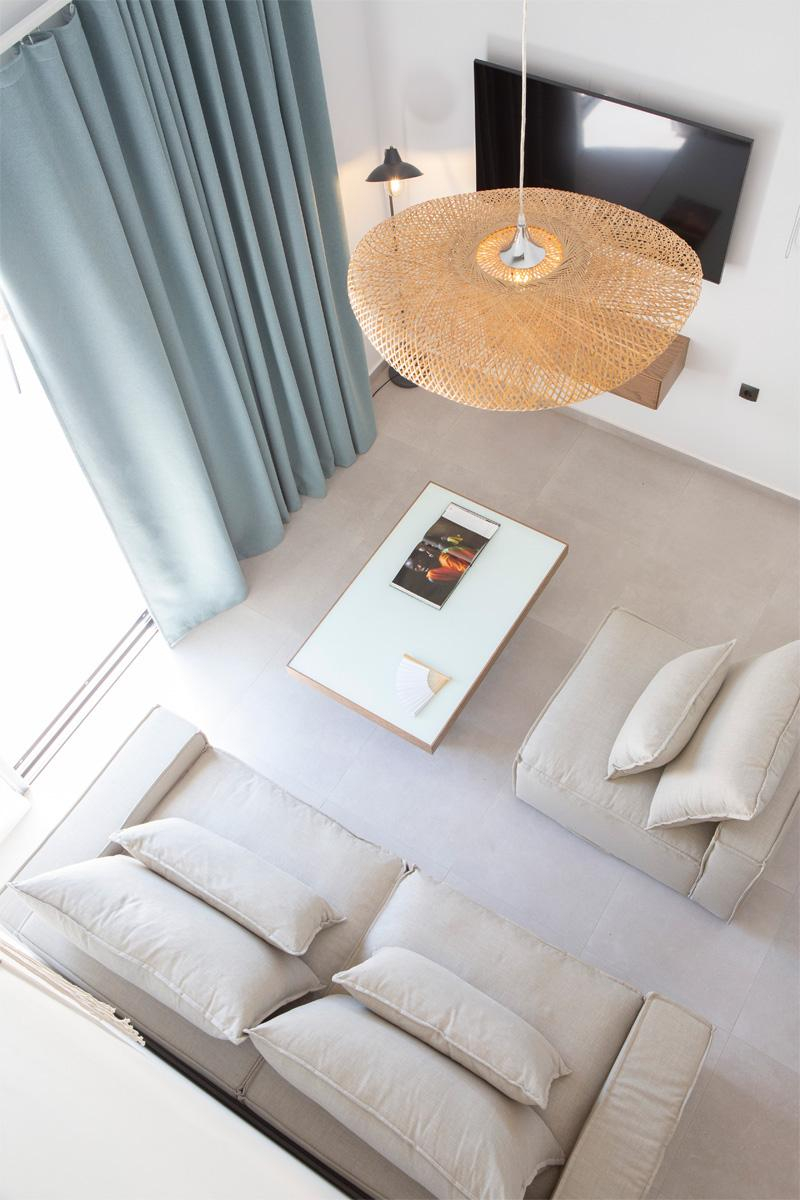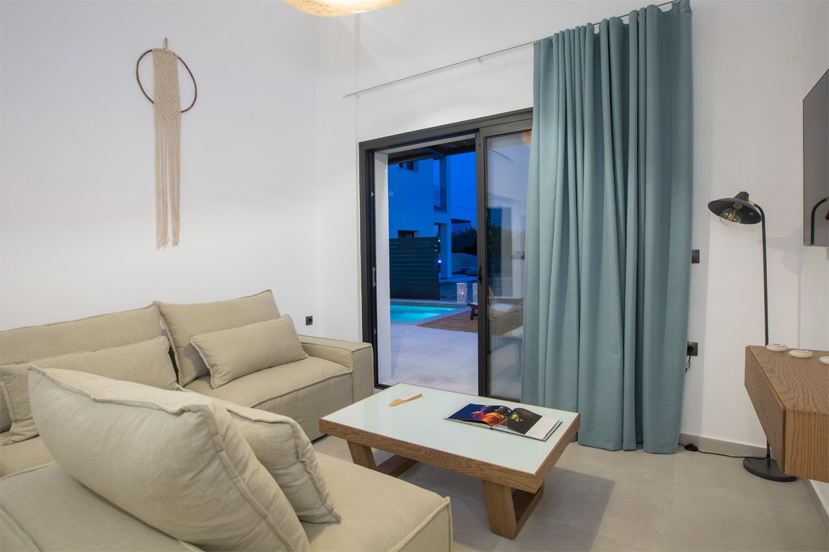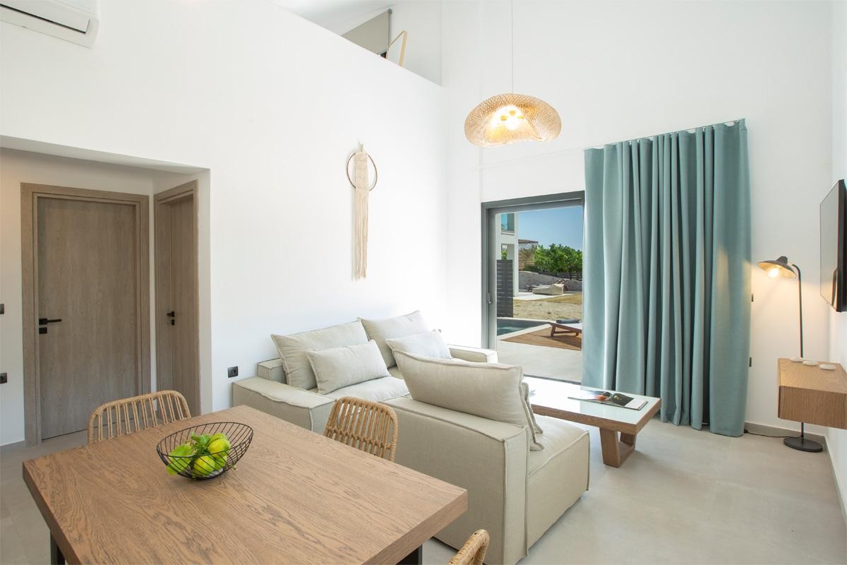 אזור מגורים מרווח בחלל מלא באור טבעי המוביל למרפסת החיצונית ולבריכת השחייה.