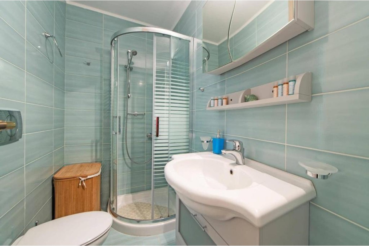 בחדר השינה הזוגי הצבוע בצבעיי הפסטל התכולים יש גם חדר רחצה ושרותים צמודים עם מקלחת.