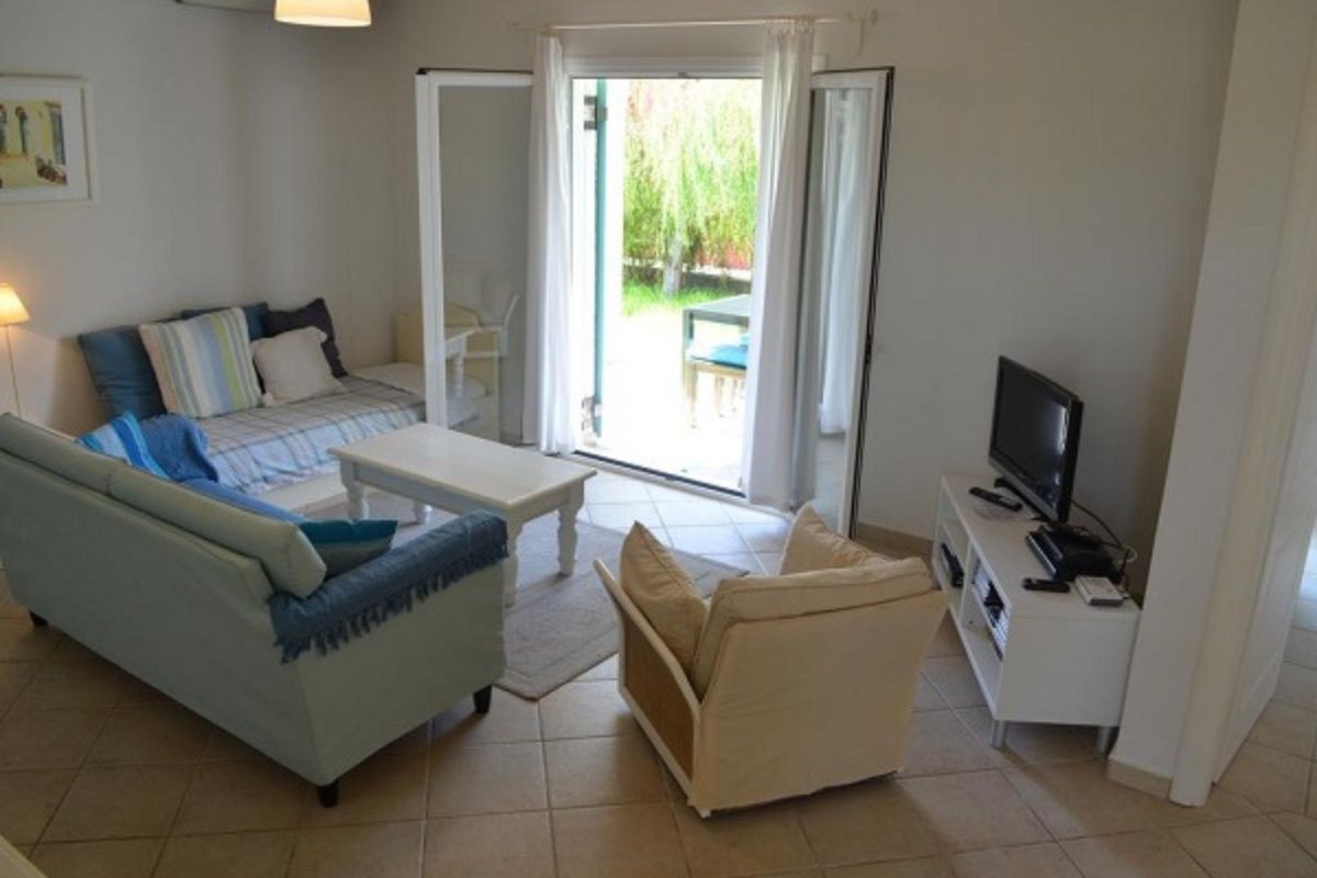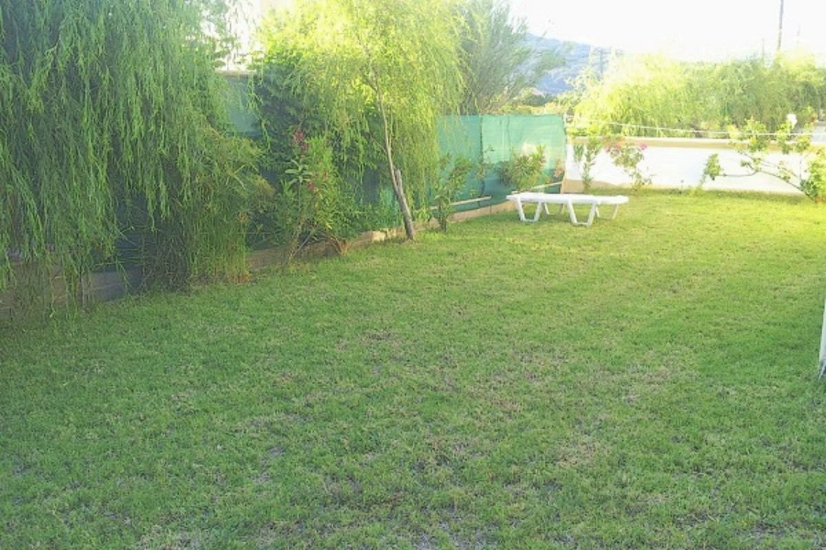 הסלון נפתח למרפסת קטנה וממנה לחצר מטופחת עם דשא לשיזוף או ארוחות בחוץ.